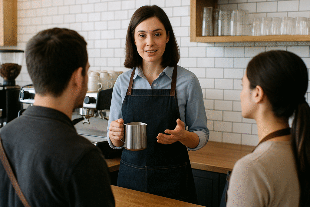 Great baristas don’t just make coffee—they create experiences. Emphasize hospitality skills such as: